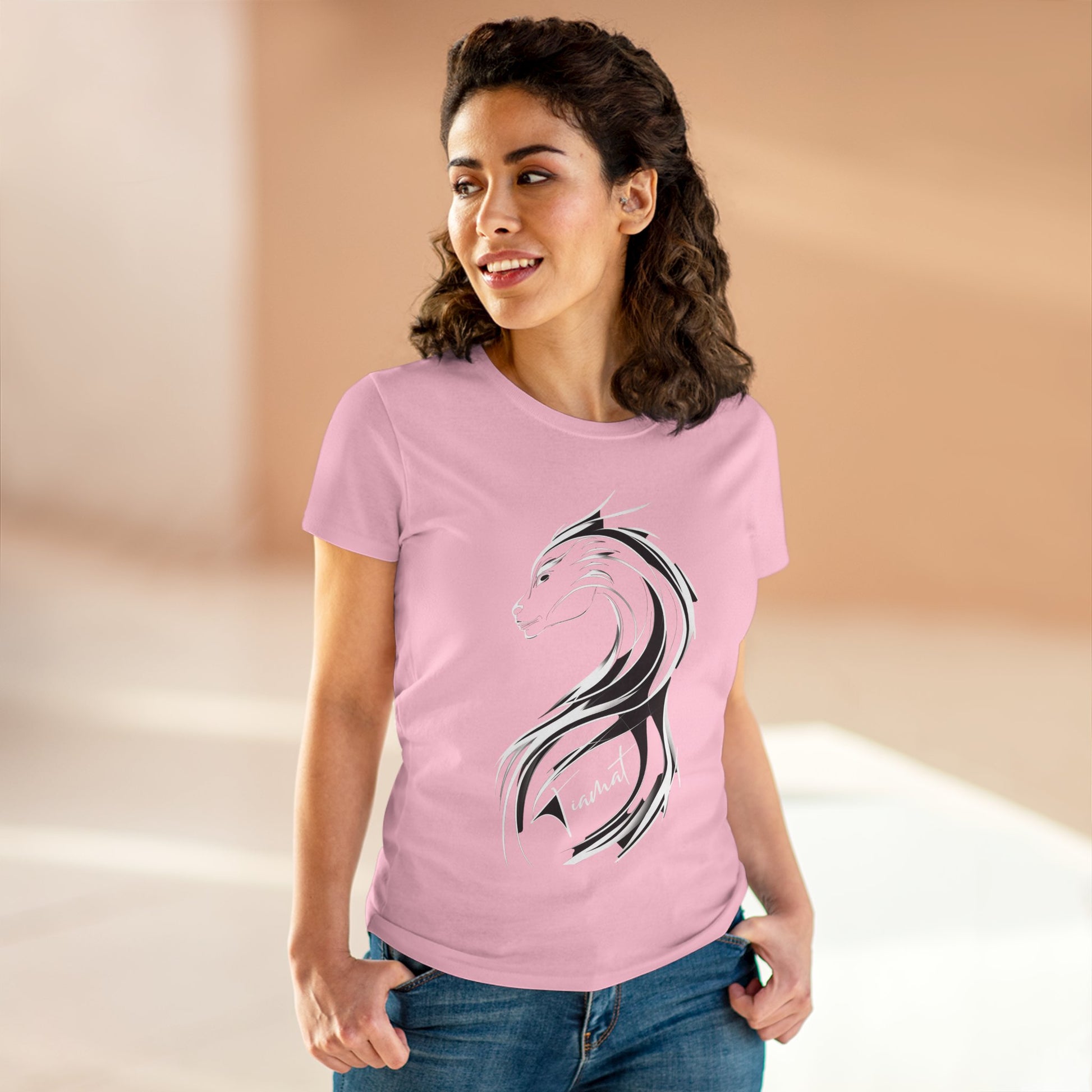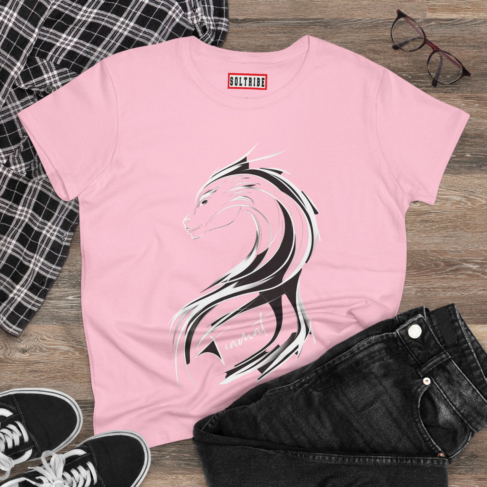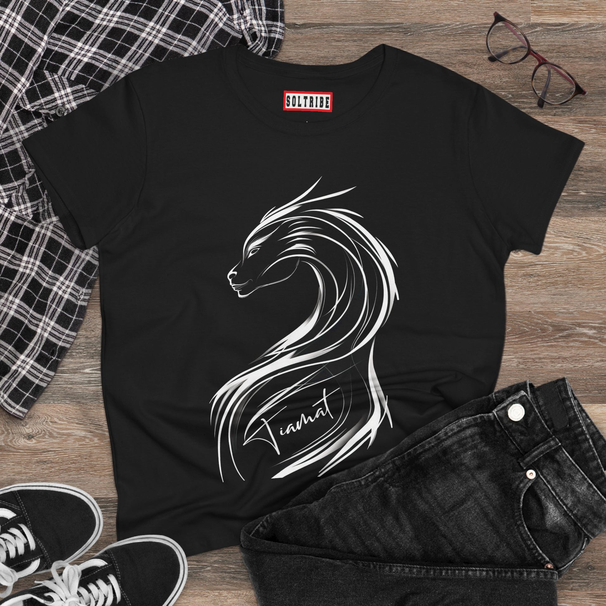 Represent your tribe in fashion with our TIAMAT Logo Tee. This medium-weight cotton tee is perfect for women who want to show off their connection to MahMah Tea's Sol-Tribe. The semi-fitted style is comfortable for everyday wear and the tear-away label adds convenience. Perfect for casual outings or lounging at home, this tee is a must-have for any Sol-Tribe member.
